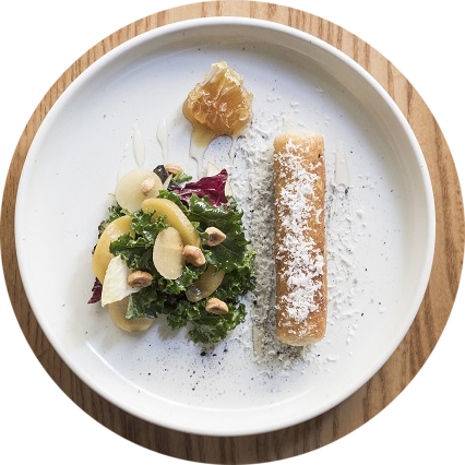 Southland cheese rollBitter leaves, pickled swede, hazelnut & pear